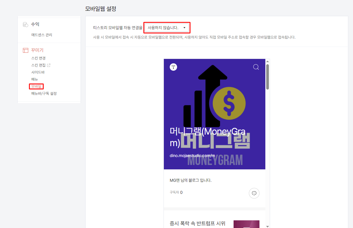 모바일에서 티스토리로 들어갔을 때, 보여지는 모바일용 티스토리가 있습니다. 이것을 사용하지 않음으로 설정해야 PC 버전으로 보여져 애드센스가 정상적으로 노출됩니다.