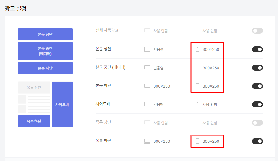 세팅 내역을 확인한 뒤, 모바일 크기에 맞는 300X250 사이즈로 지정해주세요.