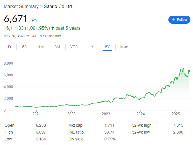 2020년 츠지 CEO 취임 이후 2024년 산리오의 주가는 약 150% 상승하여 도쿄 증시의 평균 상승률을 크게 웃돌았습니다. 2025년 5월 기준, 주가는 약 6,084엔으로 52주 최고가인 7,315엔에 근접하고 있습니다. 이는 투자자들이 산리오의 미래 성장 가능성을 높게 평가하고 있음을 보여줍니다.