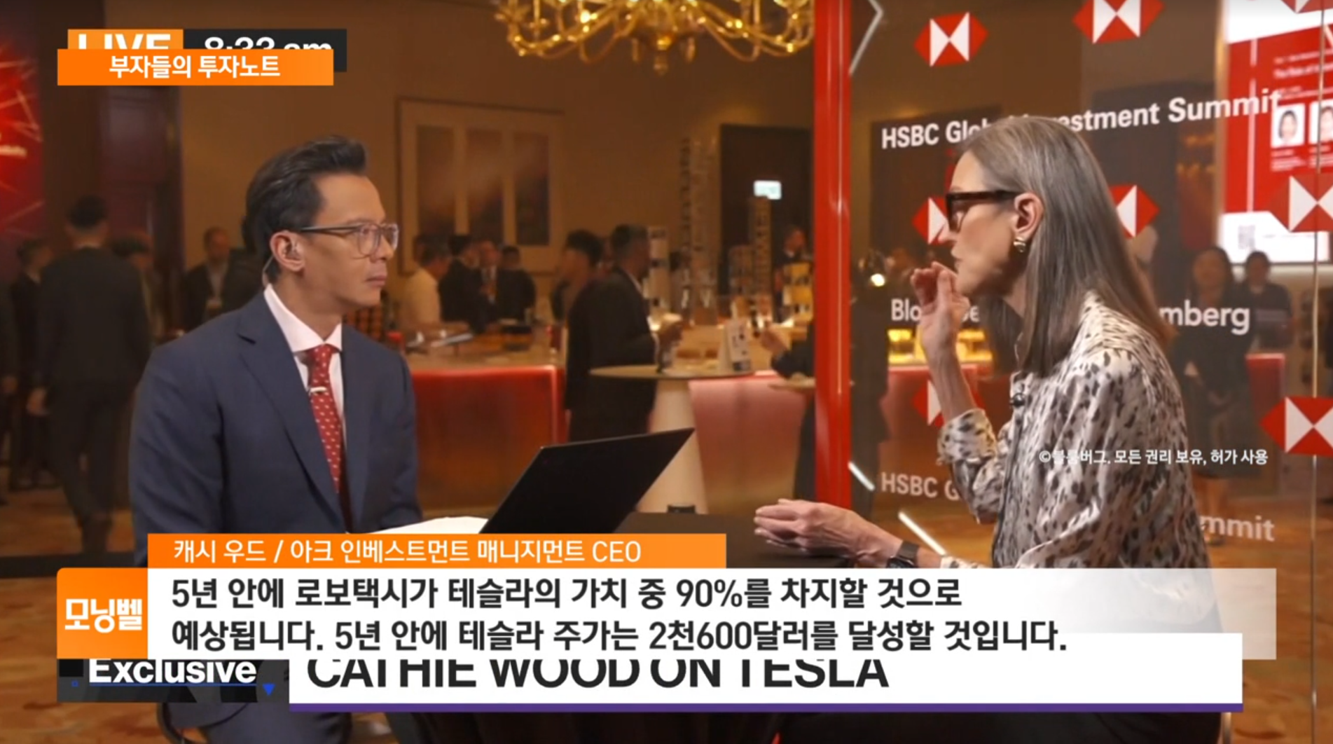 테슬라의 주가 상승 흐름에 긍정적인 영향을 준 인물은 ‘돈나무 언니’로 불리는 캐시 우드, 아크인베스트먼트(ARK Invest) 최고경영자(CEO)입니다. 홍콩 HSBC 글로벌 투자 서밋에서 진행된 블룸버그TV 인터뷰를 통해, “향후 5년 내 테슬라 주가는 2,600달러까지 약 10배 상승할 수 있다. 테슬라의 로보택시 사업이 향후 기업 가치의 90%를 차지할 것이고, 현재 테슬라가 개발 중인 인간형 로봇은 아직 주가에 반영되지 않았다”고 덧붙였습니다.
