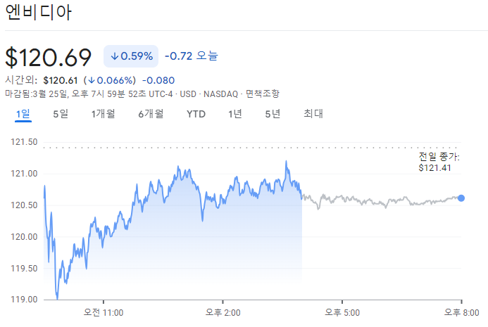 엔비디아는 금일 0.59% 하락하여, 현재 주가는 $120.69입니다. 엔비디아를 2배 추종하는 NVDL은 1.03% 하락해 $46.30 입니다.