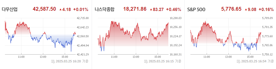 S&P 500 지수는 전일 대비 0.01% 상승한 42,587, 나스닥 지수는 0.46% 상승한 18,271, 다우존스 산업평균지수는 0.16% 상승한 5,776.65를 기록하고 있습니다.