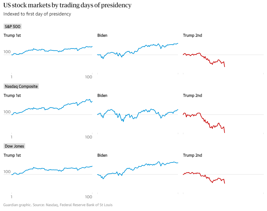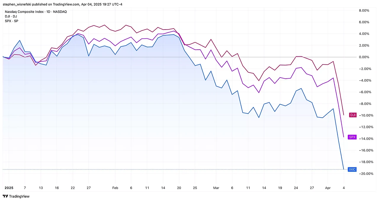 나스닥은 2022년 이후 처음으로 베어마켓(최고점 대비 20% 이상 하락)에 진입했고, 다우존스는 수정 구간(최고점 대비 10% 이상 하락)에 들어섰습니다. S&P 500 지수는 지난 이틀간 약 5조 달러의 시가총액이 증발했으며, 11개월 만에 최저 수준으로 하락했습니다.