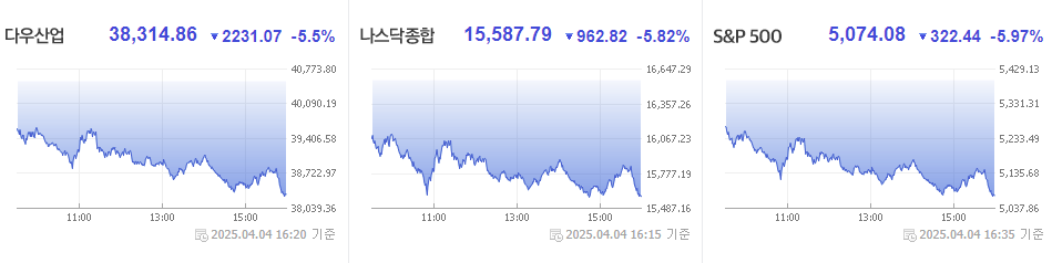 - 다우존스 및 주요 미국 주가지수 트럼프 관세 정책 발표 이후 2020년 이후 최악의 하락폭을 기록