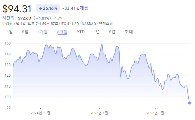 엔비디아의 주가는 트럼프 관세와 중국의 대응 관세 발표 이후 심각한 하락세를 보이며 심리적 고비선인 $100 아래로 떨어졌습니다. 4월 4일 기준으로 전일 대비 7.36% 하락한 94.31달러에 마감하였습니다. 특히, 주가가 100달러 아래로 떨어진 것은 작년 8월 이후 처음입니다.