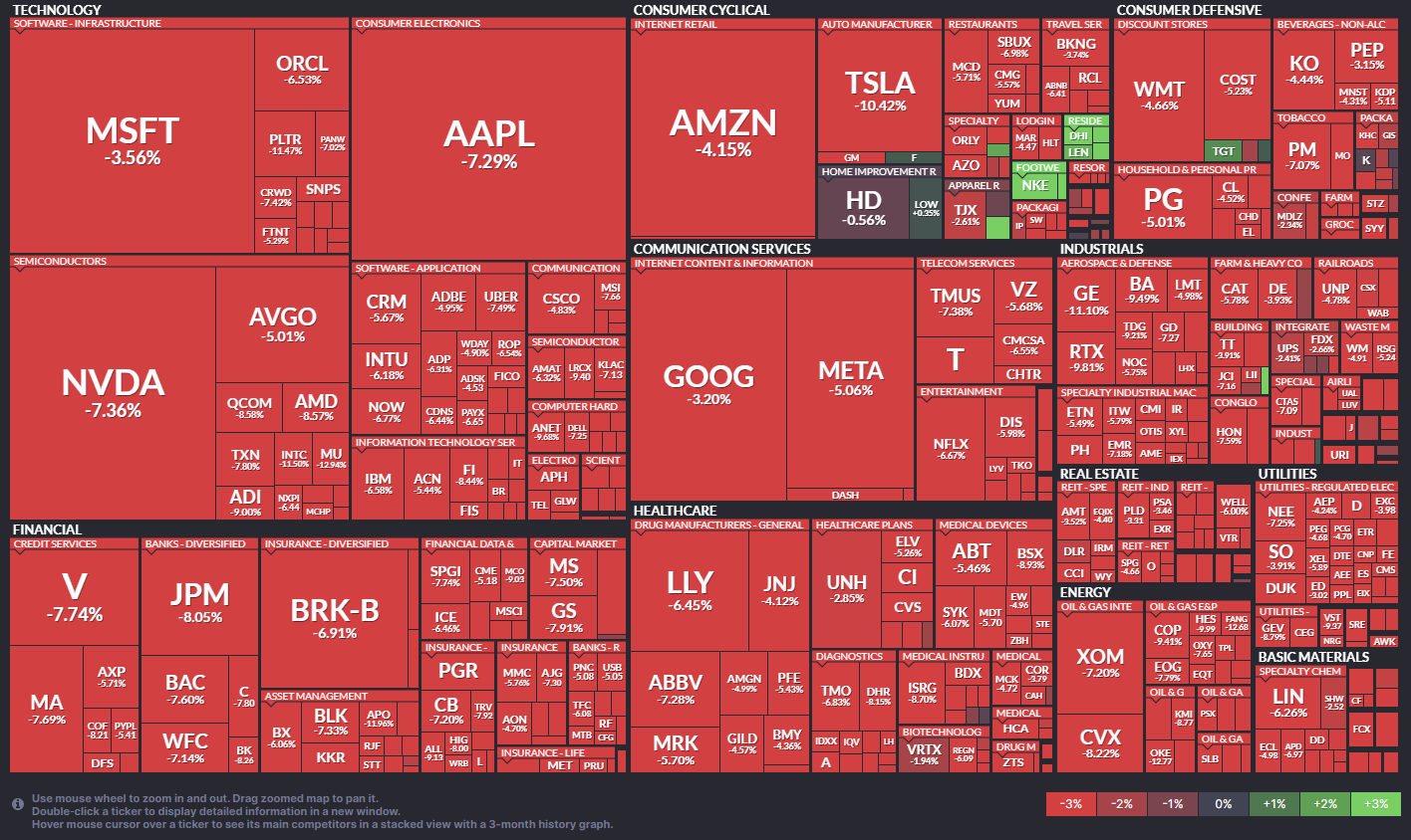 - 테크 주식: 메타, 아마존, 애플 등 주요 기술 주식들은 각각 9~10% 하락하며 주요 손실을 기록했습니다 .