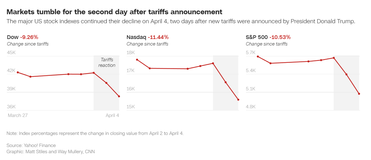 다우존스 산업평균지수는 2,231포인트(5.5%) 급락하며 최저점을 기록했고, S&P 500은 6% 가까이 하락하며 2020년 코로나19 팬데믹 이후 최대 규모의 하락입니다. 투자자들은 관세로 인해 기업 이익 감소, 경제 성장 둔화 가능성에 대한 우려를 키우며 주요 주식을 대규모로 매도했습니다.