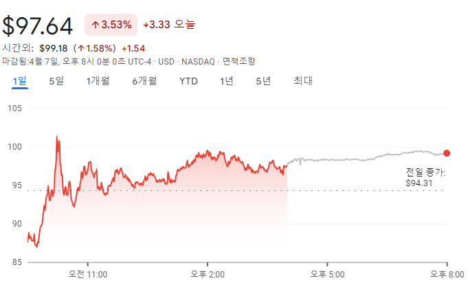 엔비디아는 4월 7일 기준으로 전일 대비 3.53% 상승한 97.64달러에 거래를 마쳤습니다.
