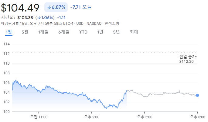 엔비디아는 4월 17일 기준으로 전일 대비 6.87% 하락한 104.49달러에 거래를 마쳤습니다.