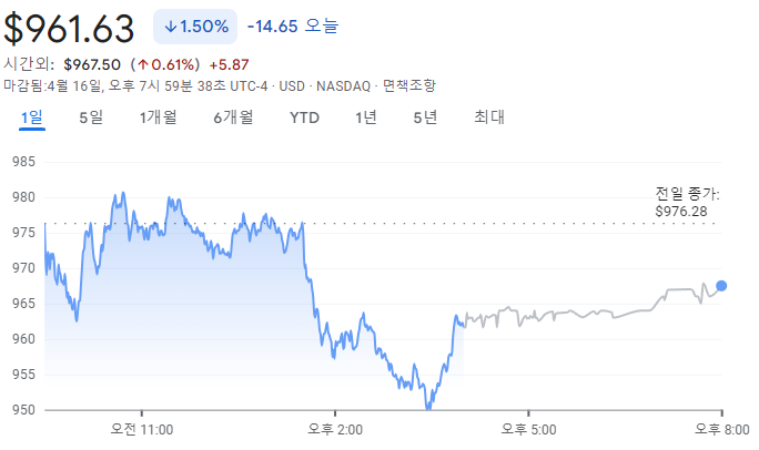 넷플릭스는 4월 17일 기준으로 전일 대비 1.5% 하락한 961.63달러에 거래를 마쳤습니다.