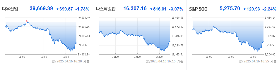 2025년 4월 16일(현지시간), 뉴욕 증시는 중국과의 무역 갈등 심화와 트럼프 대통령의 수출통제 강화 발언 여파로 전반적인 약세를 기록했습니다.