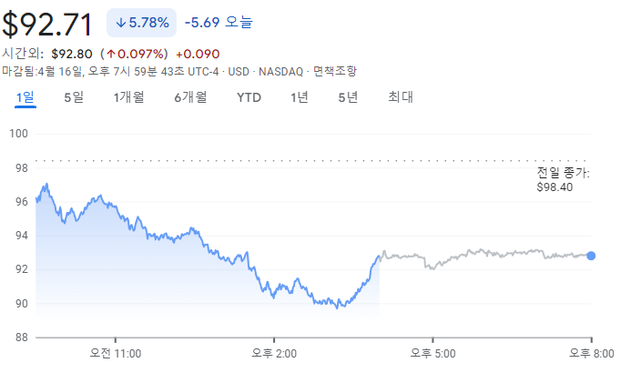 팔란티어는 4월 17일 기준으로 전일 대비 5.78% 하락한 92.71달러에 거래를 마쳤습니다.