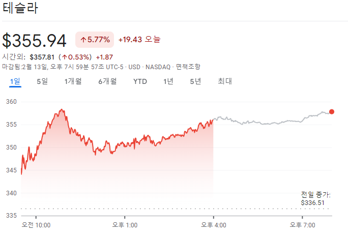 테슬라 주식이 금일 5.8% 상승하여, 현재 주가는 $355.94입니다. 테슬라를 2배 추종하는 TSLL은 11.62% 상승해 $ 20.27 입니다.