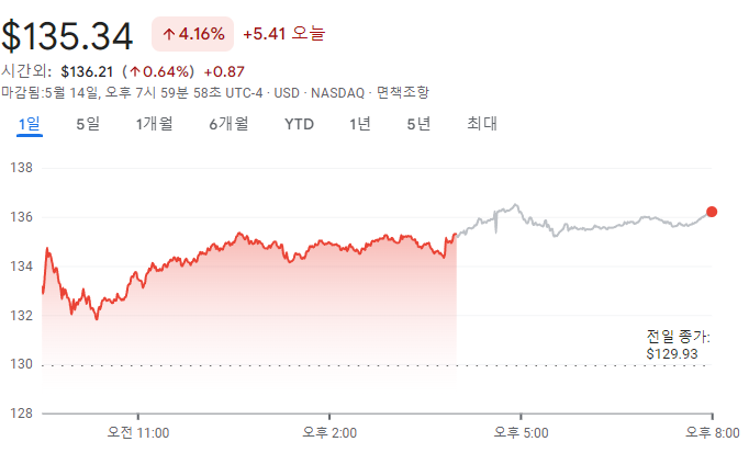 엔비디아는 5월 14일 종가 기준 135.34달러로 마감하며 전일 대비 4.15% 상승했습니다.