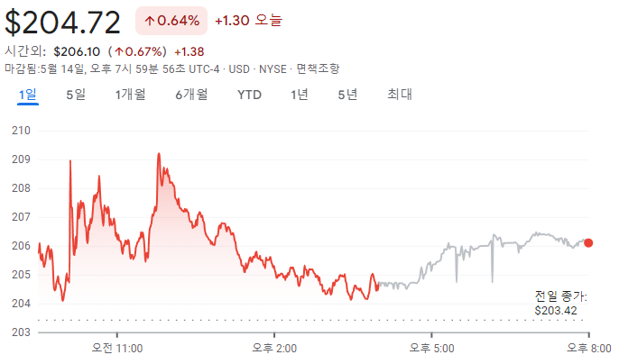 보잉은 5월 14일 종가 기준 204.72달러로 마감하며 전일 대비 0.64% 상승했습니다.