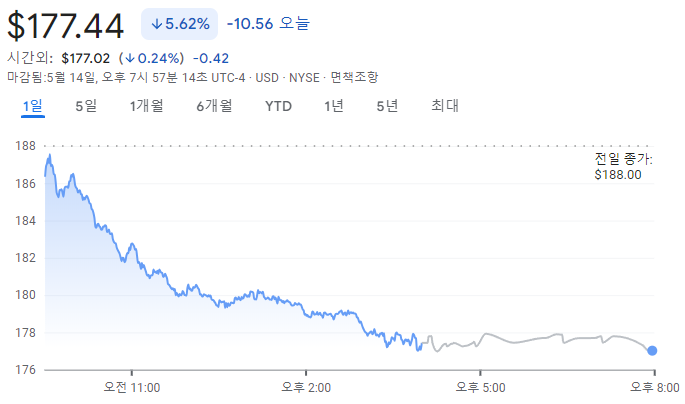 애브비는 5월 14일 종가 기준 177.44달러로 마감하며 전일 대비 5.62% 하락했습니다.
