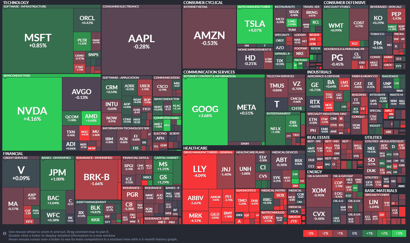특히 엔비디아(+4.16%), 테슬라(+4.07%), 구글(+3.68%) 등 대표적인 빅테크와 AI 관련주들이 강하게 상승하며 시장을 이끌었어요. 반면, 애브비(-5.62%), 릴리(-4.09%) 등 헬스케어 섹터는 실적과 전망 이슈로 크게 하락해 섹터별 극명한 온도차를 보였습니다.