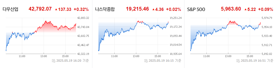 5월 19일(현지시간), 미국 증시는 무디스의 국가 신용등급 강등에도 불구하고 주요 지수들이 상승 마감했습니다. 투자자들은 초기의 불안감을 극복하고, 기술주 중심의 반등과 일부 기업들의 호재에 주목하며 시장을 이끌었습니다. 그럼 19일 미국 주식 분석을 시작할게요~