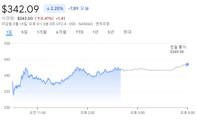 테슬라는 5월 19일 종가 기준 $342.09로 전일 대비 -2.25% 하락했습니다.