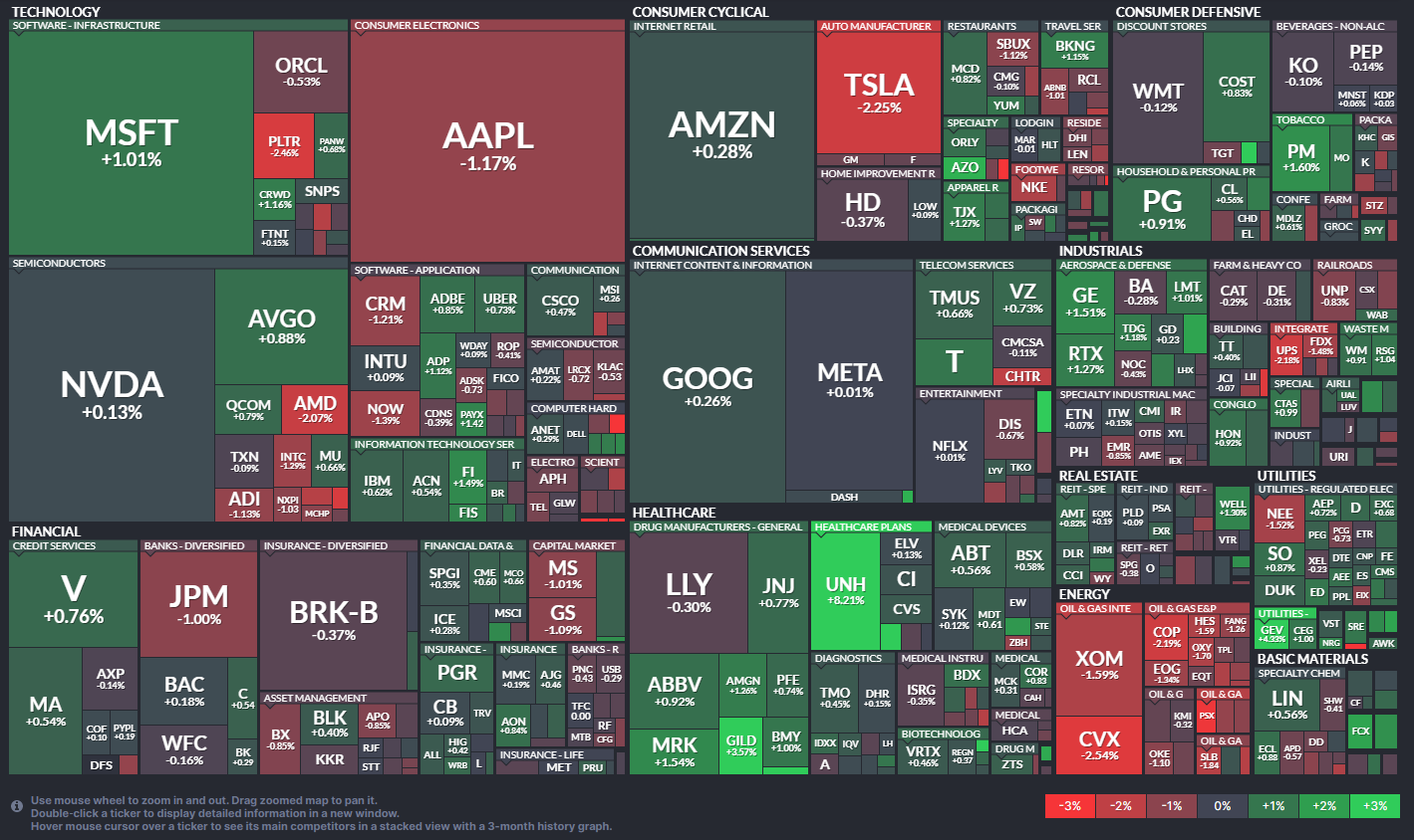 대형 기술주와 일부 헬스케어 종목을 중심으로 상승 흐름을 보인 장이였고, 마이크로소프트(+1.01%), 애브비(+0.92%), 유나이티드헬스(+8.71%) 등이 강세를 보인 반면, 테슬라(-2.25%), 애플(-1.17%) 등 일부 주요 종목은 하락했습니다. 섹터별로는 기술주가 시장을 견인한 가운데, 헬스케어와 금융 섹터 내 종목별 엇갈림이 두드러졌습니다.