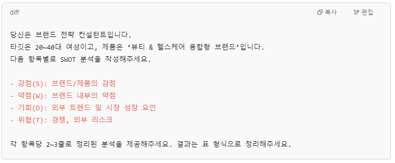 기본 프롬프트 예시 : “국내 20~40대 여성을 대상으로 한 뷰티 헬스 브랜드의 SWOT 분석을 해줘.”