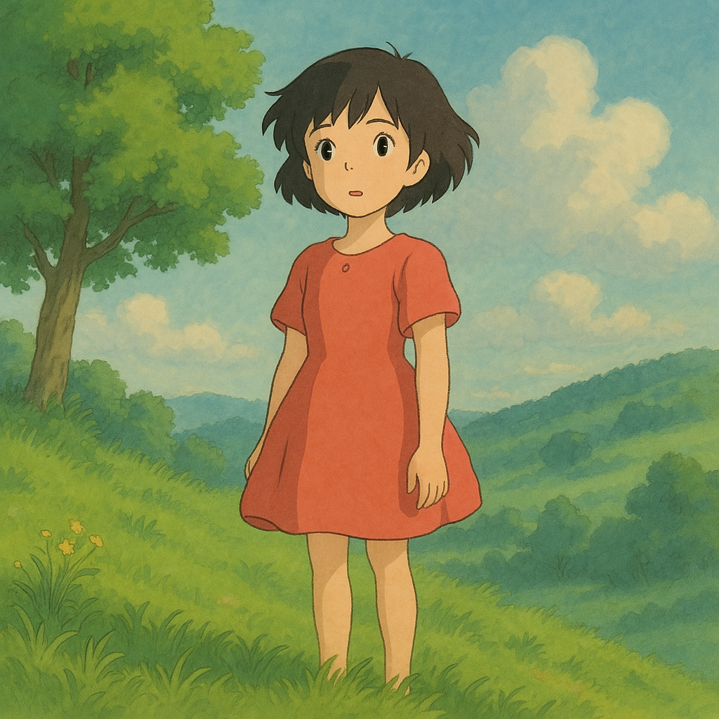 “A girl with short black hair and a red dress standing on a green hill, Ghibli style, dreamy atmosphere, soft lighting” |
