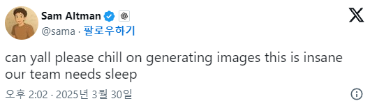 챗GPT의 지브리 스타일 그림 생성은 세계적으로 큰 인기를 끌면서, 오픈AI 서버에 과부하가 걸리고 샘 알트만이 "우리팀이 잠을 못 자고 있다"는 호소문을 SNS에 올리기도 했습니다.